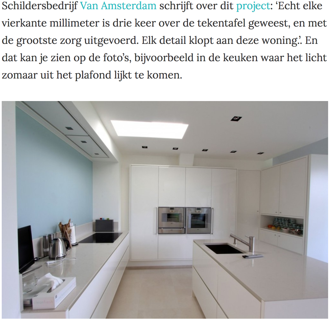 Schildersbedrijf Van Amsterdam schrijft over dit project: ‘Echt elke vierkante millimeter is drie keer over de tekentafel geweest, en met de grootste zorg uitgevoerd. Elk detail klopt aan deze woning.’. En dat kan je zien op de foto’s, bijvoorbeeld in de keuken waar het licht zomaar uit het plafond lijkt te komen.